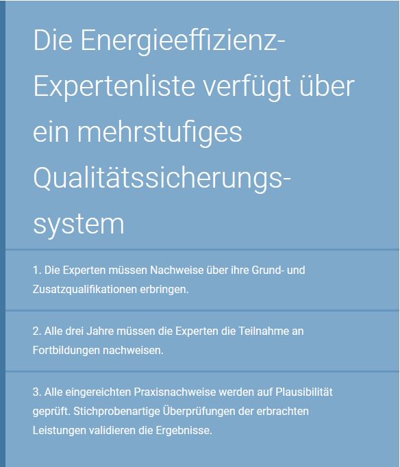 Die Berufsbezeichnungen Energieberater und Energieeffizienz-Experte sind nicht geschützt. Um trotzdem einen hohen qualitativen Standard der Bau- und Sanierungskonzepte zu garantieren, betreut die Deutsche Energie-Agentur (dena) eine Energieeffizienz-Expertenliste für Förderprogramme des Bundes. Für Fördermittel von BMWi, KfW und BAFA sowie für die Steuerförderung sind ausschließlich die auf der Liste verzeichneten Energieberater zugelassen. Die vollständige Liste finden Sie online unter www.energie-effizienz-experten.de.