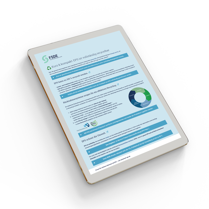 Während seiner langen Nutzungsdauer von 40 Jahren und mehr spart besonders graues EPS sehr viel Energie und CO2 ein. Wie umweltschonend EPS-Dämmungen allerdings tatsächlich sind, zeigt vor allem die Frage nach dem "danach". Fakt ist: Der Dämmstoff ist mittlerweile zu 100 % recycelbar. Dabei sorgen vor allem die derzeitigen Rücknahmesysteme für ein effektives Recycling. Somit leistet eine Dämmung mit EPS einen nachhaltigen, ökologischen Beitrag für den Klimaschutz. Einen genaueren Überblick dazu liefert das neue Infomittel mit wichtigen Fakten zu Rücknahme und Wiederverwertung des Dämmstoffs.