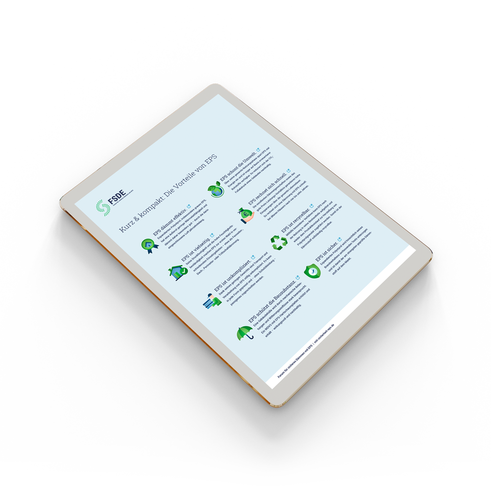 Der Dämmstoffmarkt vergrößert und verändert sich stetig. Die Frage nach dem geeigneten Dämmstoff ist daher so wichtig wie nie. Hierbei nehmen insbesondere Dämmungen mit EPS einen wichtigen Stellenwert ein: Dank ihrer positiven Eigenschaften stehen sie alternativen Dämmstoffen in Sachen Sicherheit, Wirtschaftlichkeit und Nachhaltigkeit in nichts nach. Das neue Infomittel bietet einen guten Überblick über die wichtigsten Vorteile und zeigt, wieso EPS bei der Dämmung von Dach und Fassade die geeignete Wahl ist.