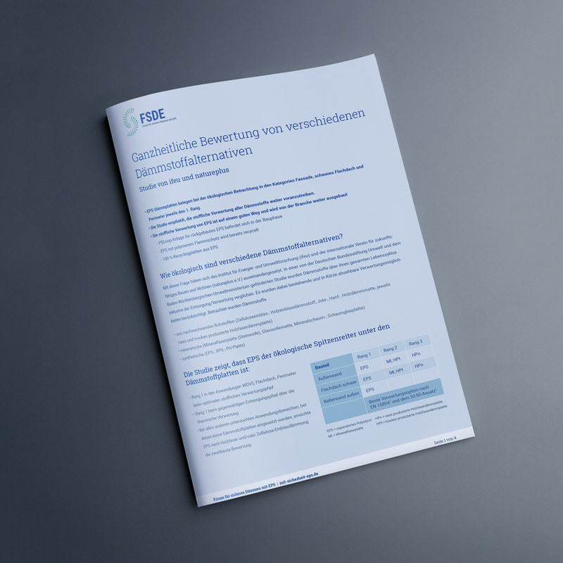 In einer Studie des ifeu und des natureplus e.V. wurde der gesamte Lebensweg von EPS von der Herstellung bis zur Verwertung beleuchtet. Ein Vergleich mit anderen in der Studie behandelten Dämmstoffen zeigt: EPS zählt zu den ökologischen Spitzenreitern. In diesem übersichtlichen Vierseiter werden die Ergebnisse zu EPS zusammengefasst und in den Gesamtkontext der Verwertung gesetzt.