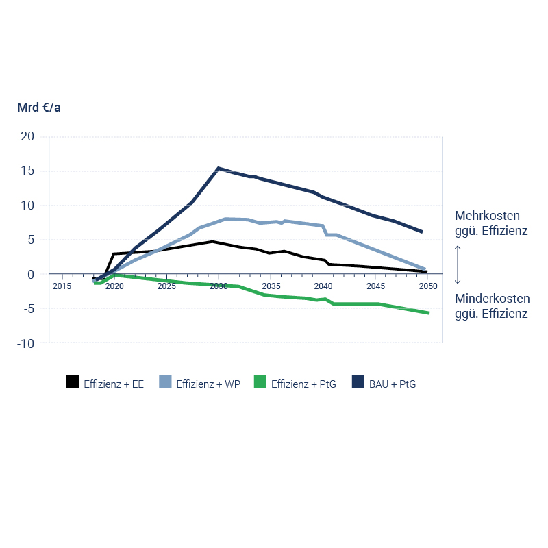 Fünf Szenarien hatte Agora Energiewende in der Studie miteinander verglichen, die alle in der Lage sind, bis zum Jahr 2030 die erforderlichen 70 bis 72 Millionen Tonnen an Treibhausgasemissionen einzusparen (siehe Grafik). Das Vergleichsszenario Effizienz² setzt dabei auf Technologien, die bereits seit Jahrzehnten "massenhaft" im Einsatz sind und baut sie im nötigen Maßstab aus, um die Klimaziele noch zu erreichen. Dazu gehört genauso eine Erhöhung der energetischen Sanierungsrate (auf bis zu 2,2%) inklusive entsprechenden Dämmmaßnahmen wie die Nutzung von Wärmenetzen und Wärmepumpen. Nur ein Szenario stellte sich als noch wirtschaftlicher heraus – die Kombination aus Effizienz² und dem Einsatz von mehr Wärmepumpen. Ähnlich lautet das Resümee der Gebäudestudie der Deutschen Energieagentur (dena): Ein "Technologiemix" sei besonders geeignet, die geforderten Kohlendioxideinsparungen bis 2030 zu erreichen. Dazu gehört eine dichte Gebäudehülle (und höhere Sanierungsraten), eine Modernisierung der Anlagentechnik und der Einsatz erneuerbarer Energien.