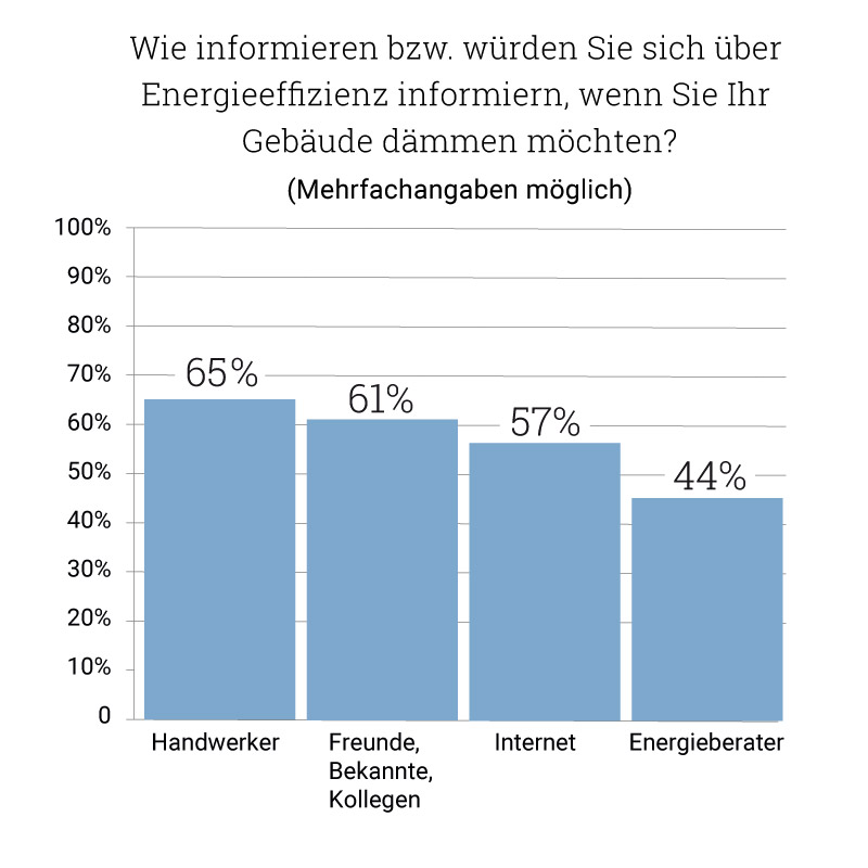 Als größtes Defizit deckt die Studie den Mangel an fundierten Informationen zum Nutzen einer Energieberatung auf: Nur 44% der Eigentümer nennen den Energieberater als Anlaufstelle für Fragen zur Energieeffizienz, 65% wenden sich an den Handwerker, 61% lediglich an Freunde, Bekannte oder Kollegen. Auch als Anbieter für Energiedienstleistungen sind Energieberater noch nicht weitläufig bekannt: Nur 49% der Hausbesitzer geben den Energieberater als eine ihnen bekannte Anlaufstelle für Energieberatungen an. 84% nennen Handwerker und Schornsteinfeger, 78% die Stadtwerke und Energieversorger und 70% die Verbraucherzentrale.