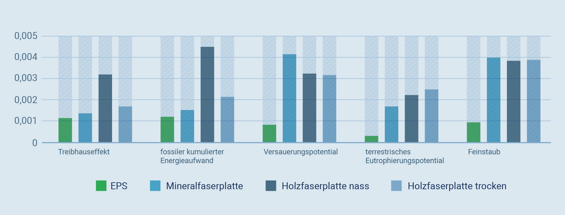 In einem weiteren Schritt wurden die Umweltwirkungen für verschiedene Bauteile ermittelt. Hierfür wurden Dämmstoffe in den Umweltkategorien3 Treibhauseffekt, fossiler kumulierter Energieaufwand, Versauerungspotenzial, terrestrisches Eutrophierungspotenzial und Feinstaub miteinander verglichen.